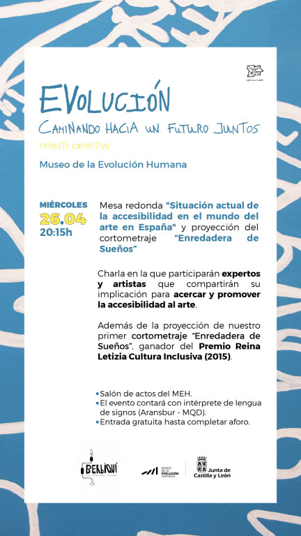 Esta actividad está enmarcada dentro del proyecto expositivo: “Evolución: caminando hacia un futuro juntos” una muestra expositiva en el Museo de la Evolución Humana, donde a través de creaciones y distintos proyectos expositivos realizados a lo largo de su trayectoria se invita a reflexionar sobre la accesibilidad como pieza clave no sólo para el ser humano sino para nuestra sociedad.