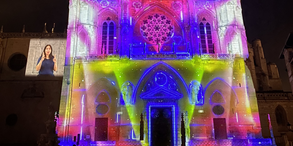 El broche final lo puso la proyección del vídeo mapping en la fachada de la Catedral, en el que, por primera vez en España, se proyectó a una intérprete de LSE, nuestra compañera Tania, sobre un edificio Patrimonio de la Humanidad, haciendo que dicha proyección fuese accesible en LSE para las personas sordas presentes. ¡Gracias a nuestros compañeros y compañeras de MQD por hacerlo posible!