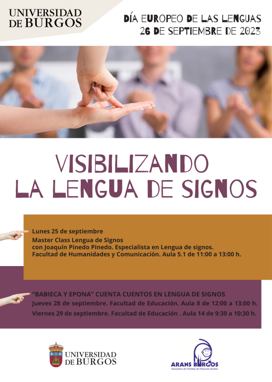 La UBU vuelve a contar con ARANSBUR para visibilizar la lengua de signos en el Día Internacional de las Lenguas, con la participación de nuestro profesor de LSE, Joaquín Pinedo que ha impartido una MASTER CLASS sobre la LSE, y un acercamiento del alumnado universitario a actividades de sensibilización sobre esta lengua dirigidas a menores, gracias a la participación en cuenta-cuentos dinamizados por las profesionales de ARANSBUR.