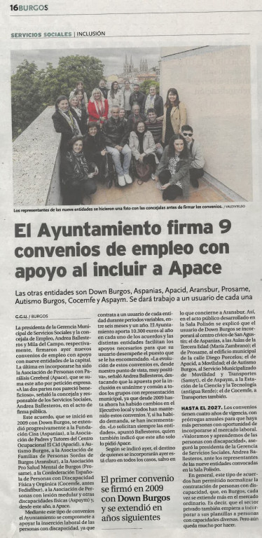 Esta semana ARANSBUR y otras 8 entidades firmaron los nuevos convenios de empleo con apoyo con el Ayuntamiento de Burgos. Mediante este tipo de convenios el Ayuntamiento se compromete a apoyar la inserción laboral de personas con discapacidad, ya que contrata a un usuario de cada entidad. Los convenios tienen cuatro años de vigencia, con prorrogas anuales para que haya más personas con oportunidad de incorporarse al mercado laboral. En ARANSBUR hemos tenido ya nueve experiencias en 5 ámbitos distintos: formación en centros cívicos, almacenes municipales, centros de día, programa infancia en centros cívicos y programa juvenil en Espacio Joven.