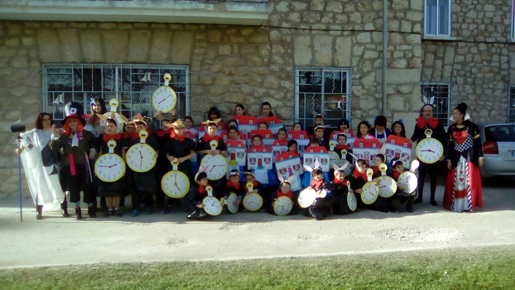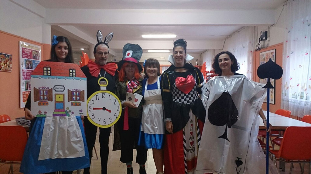 Por una parte, en el comedor de integración a la inversa en el que cada día 50 niños, sordos y oyentes, del colegio Antonio Machado comparten juegos, mesa y menú, y donde el tema elegido fue Alicia en el país de las maravillas. Los niños crearon su propia disfraz de conejo o de Alicia, con la ayuda de Santi, Trini, Marta, Ascen, Julio y Rosa.