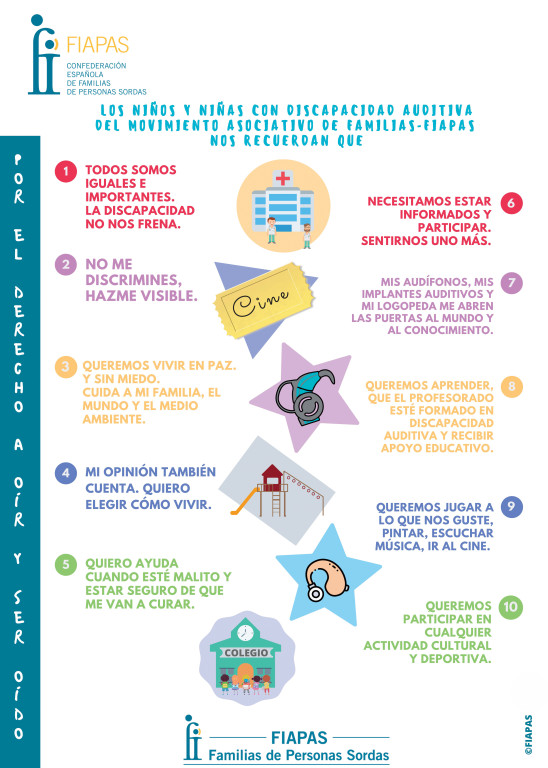 Con motivo de la conmemoración de la entrada en vigor en 2008 en España de la Convención Internacional sobre los derechos de las personas con discapacidad, la Confederación Española de Familias de Personas Sordas recuerda las reivindicaciones y reflexiones que los niños, niñas y adolescentes con discapacidad auditiva del Movimiento Asociativo de Familias-FIAPAS trasladan a la sociedad.