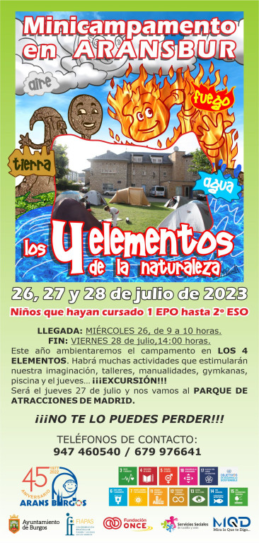 Este año ambientaremos el campamento en LOS 4 ELEMENTOS. Habrá muchas actividades que estimularán nuestra imaginación, talleres, manualidades, gymkanas, piscina y el jueves… ¡¡¡EXCURSIÓN!!! Será el jueves 27 de julio y nos vamos al PARQUE DE ATRACCIONES DE MADRID, por eso, os vamos a pedir una cantidad adicional de 10 € por niño para cubrir parte del coste de entrada y desplazamiento en autocar privado.