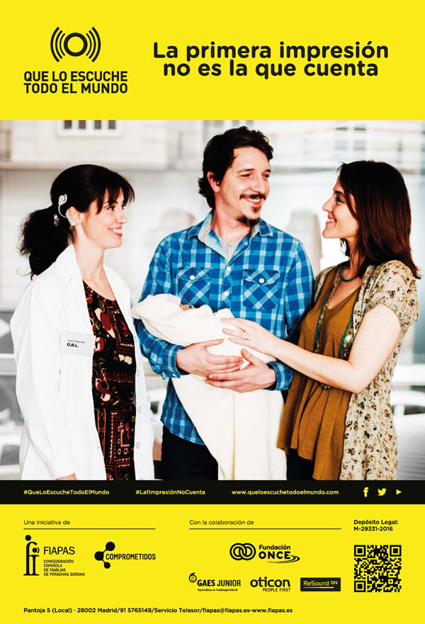 La campaña, que ha sido posible gracias a la colaboración de Fundación ONCE, Gaes Junior, OTICON y ReSound (Grupo GN), se completa con dos piezas audiovisuales que, bajo los hashtags #QueloEscucheTodoelMundo y #La1impresionNoCuenta, presentan varios testimonios de padres y madres, que demandan el papel activo de las administraciones, instituciones y profesionales implicados tanto en este proceso diagnóstico, como en el apoyo a las familias.