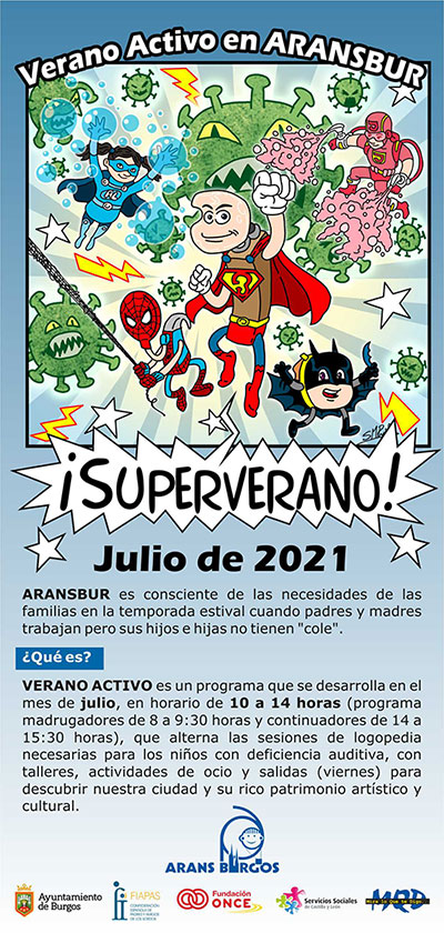 Verano Activo es un programa que se desarrolla en el mes de julio, en horario de 10 a 14 horas (programa madrugadores de 8 a 9:30 y continuadores de 14 a 15:30), que alterna las sesiones de logopedia necesarias para los niños con deficiencia auditiva, con talleres, actividades de ocio y salidas (viernes) para descubrir nuestra ciudad y su rico patrimonio artístico y cultural.